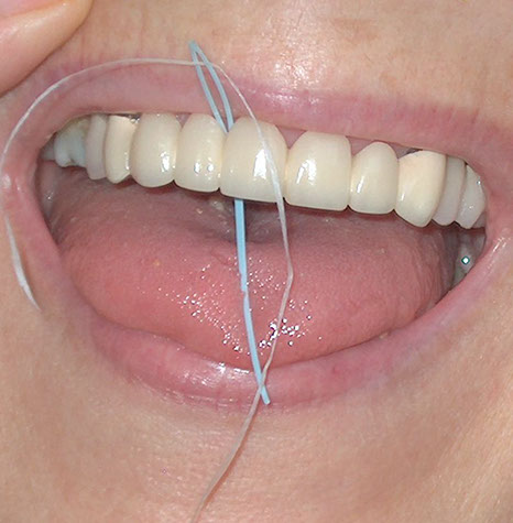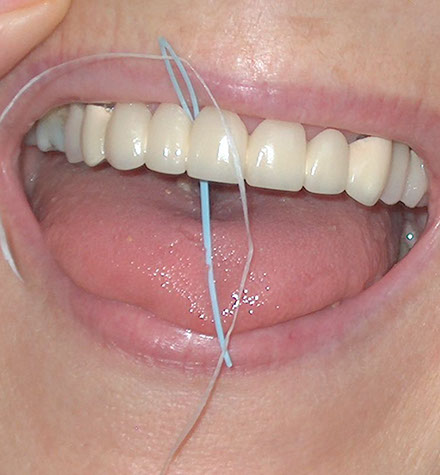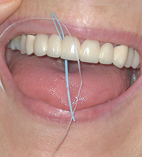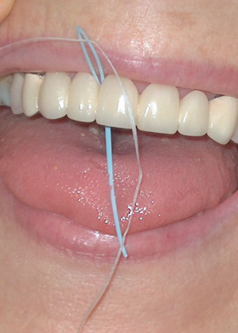 Si completerà la rimozione della Placca depositatasi tra i denti con l’ausilio del Filo Interdentale di tipo non cerato, del Dental Floss (filo interdentale “a maglia” , con estremità rigida).